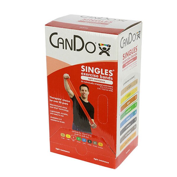 CanDo® low powder exercise band is made of natural rubber latex, which may cause allergic reactions. For those with latex sensitivities, there are latex-free alternative offerings of the CanDo® exercise band. Each resistance is packaged in a 30-piece dispenser box.