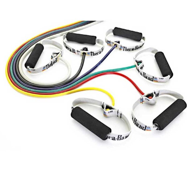 TheraBand® Tubing with Handles are made from high-quality natural rubber latex and are ideal for upper-body exercise, rehabilitation, fitness, and conditioning in the clinic or at-home. The resistance tubing makes measuring progress and achieving goals for fitness or therapy easier than ever before and includes the added convenience of attached handles for a ready-to-use solution. They are available in 7 color-coded levels of resistance, determined by thickness of the tubing, which allows users to recognize improvement as it happens and gives at-a-glance documentation of progress from one level to the next. 48" length (except black and silver, which are 50" long).